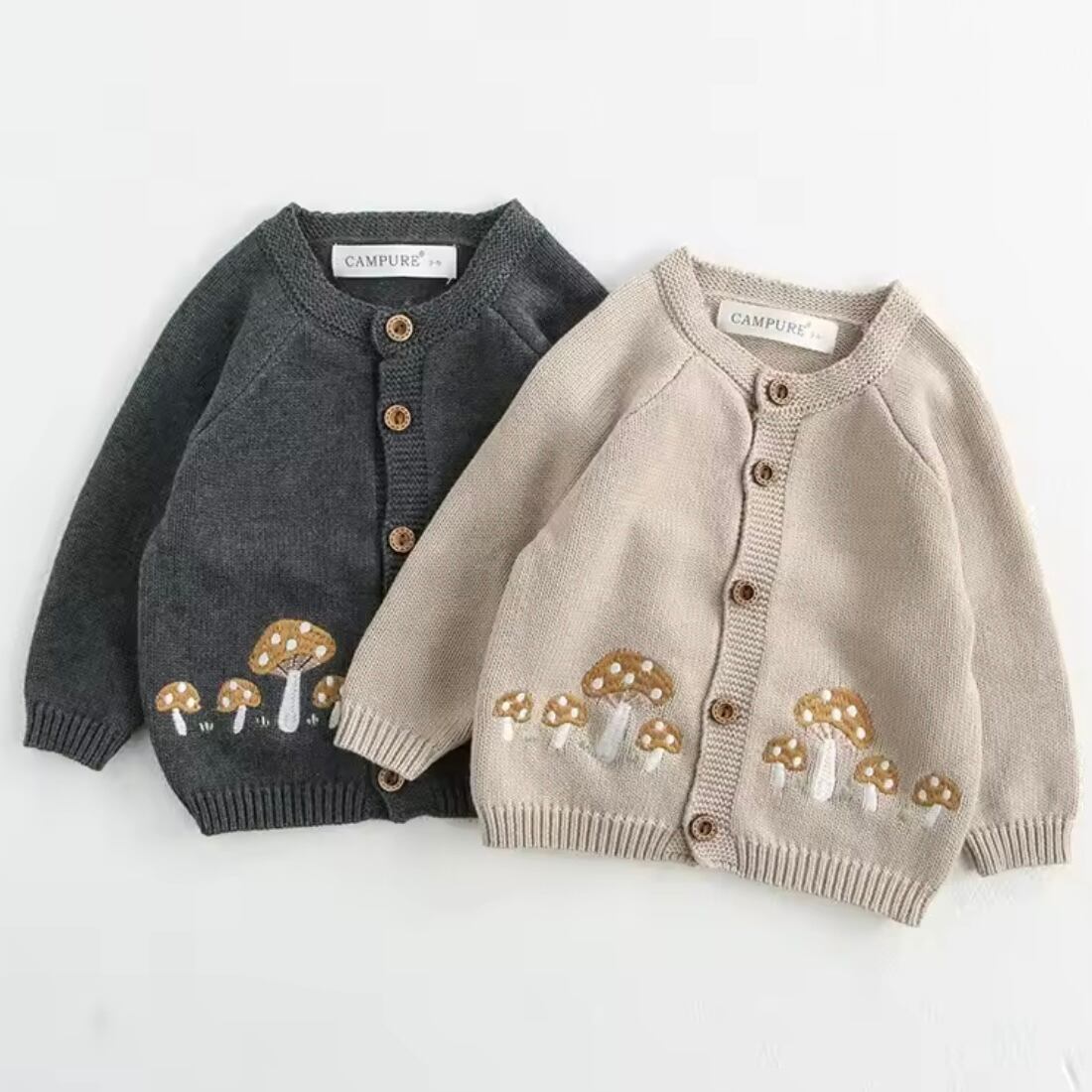 ナチュラルなカラーと可愛いキノコの刺繍がポイント。カーディガン・ロンパース・帽子でおしゃれも便利も叶います。