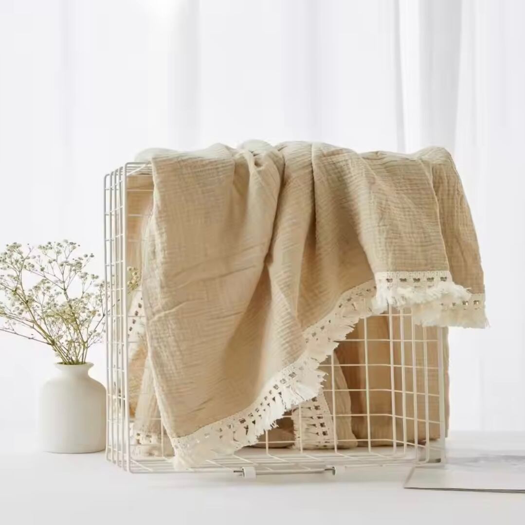 柔らかなモスリン素材で作られたブランケット。おくるみとしてはもちろん、ベビーカー掛けや授乳ケープとしても使える万能アイテムです。
