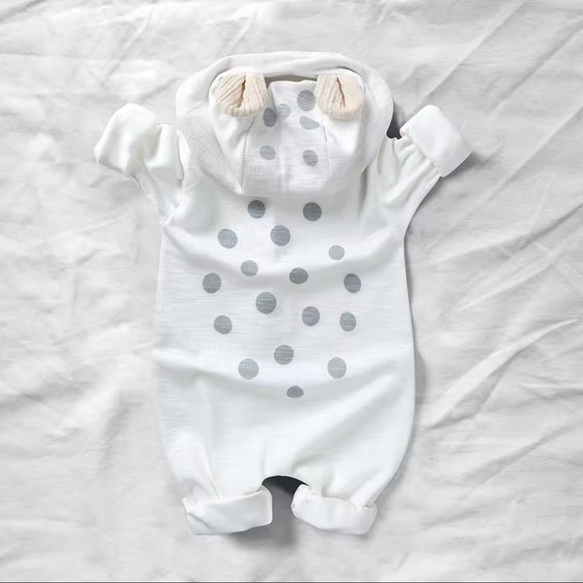 耳つきフードと水玉模様が特徴で、着るだけで赤ちゃんの可愛さがアップ♡