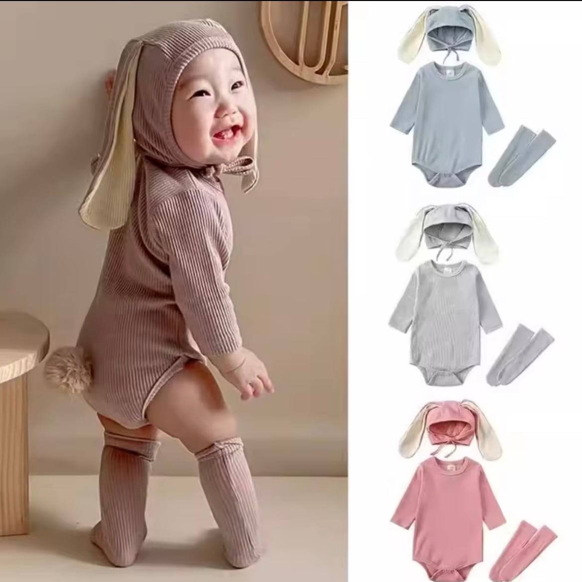 耳付きフードが可愛いロンパースに、帽子と靴下がついた3点セット。