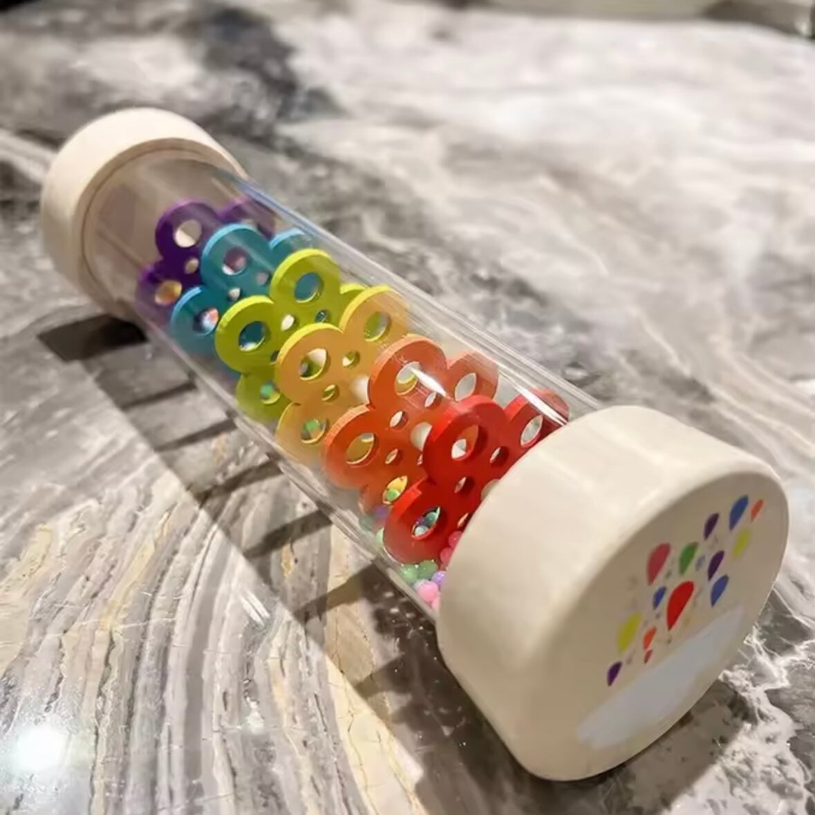 カラフルなビーズが転がるたびに、心地よい音が響く木製レインスティック。