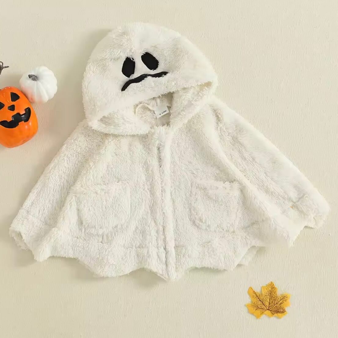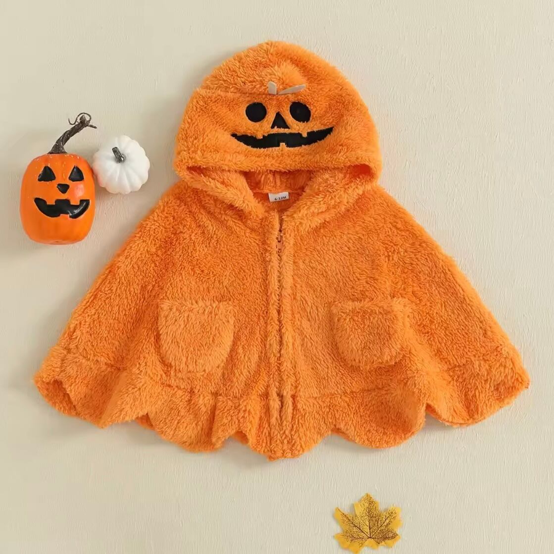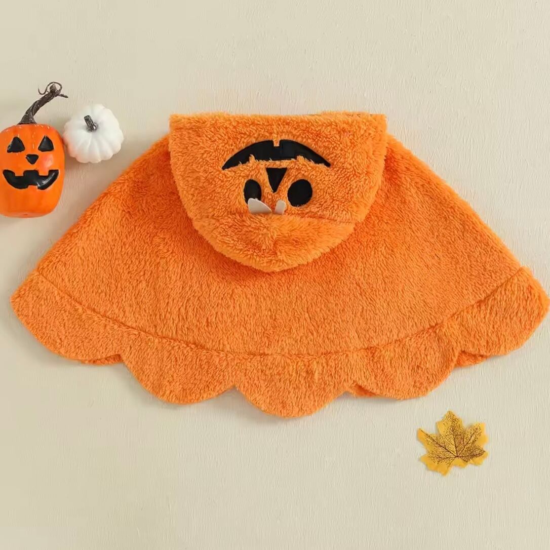パンプキンフェイスとゴーストデザインのフード付きマント。やわらかい素材で秋冬のお出かけにもぴったり。ボタンで留めるだけだから着脱も簡単です。