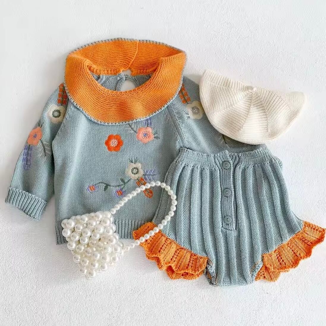 刺繍入りのトップスとフリルパンツがセットになった、秋冬にぴったりのニットコーデ。