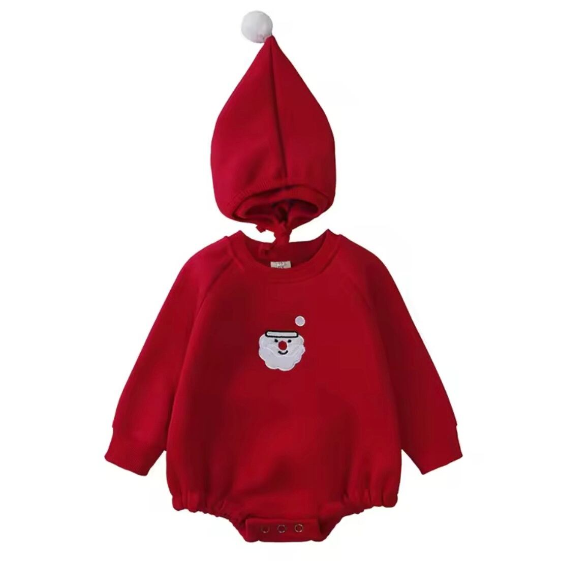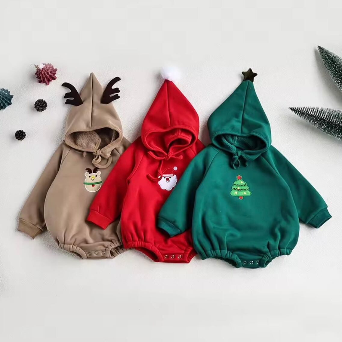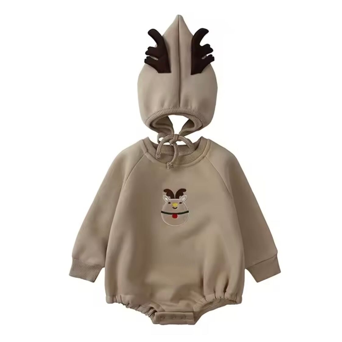 トナカイの角がちょこんと付いたフードがとっても可愛い、冬にぴったりのロンパース。